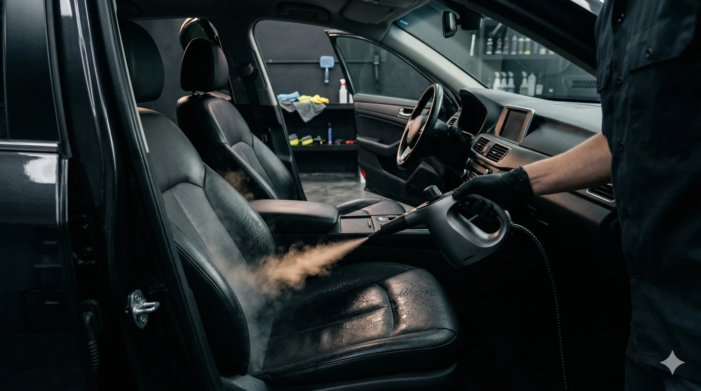 Многоэтапная чистка ткани, кожи, пластика и ковров. Экстрактор вымывает загрязнения из глубины ворса, кожаные поверхности обрабатываются восстанавливающим кондиционером.